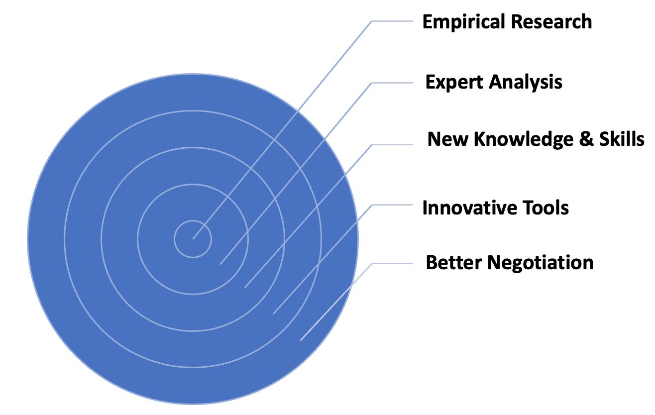 There are several inter-related steps along the path to improved negotiation performance. Real world research is the starting point, because theories and anecdotal evidence are unreliable and often lead to wrong or incomplete conclusions. Expertly analysing the results of real world research can often produce surprising results, leading to new knowledge from which new skills can be developed and shared. That new knowledge, especially when combined with new scientific and technological developments, can give rise to revolutionary new tools that in turn can improve skills and improve practice.